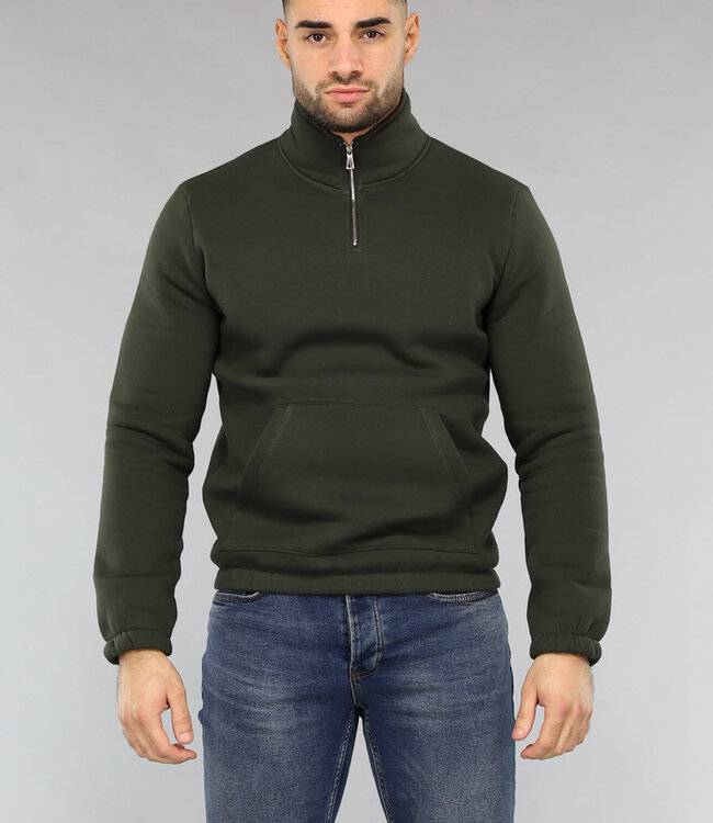 Deze fijne mannen trui is gemaakt van een stevige sweater stof. Egaal aan de buitenkant maar enorm warme fleece aan de binnenkant. De trui is aan de voorkant voorzien van een grote buidelzak. De uiteindes van de mouwen en de onderkant van de trui zijn voorzien van een elastische boorden. In de hals heeft de trui een kraag welke je kan omslaan, maar ook als een soort col kan dragen. Je kunt hiervoor de rits gebruiken om de kraag volledig naar wens af te stellen.